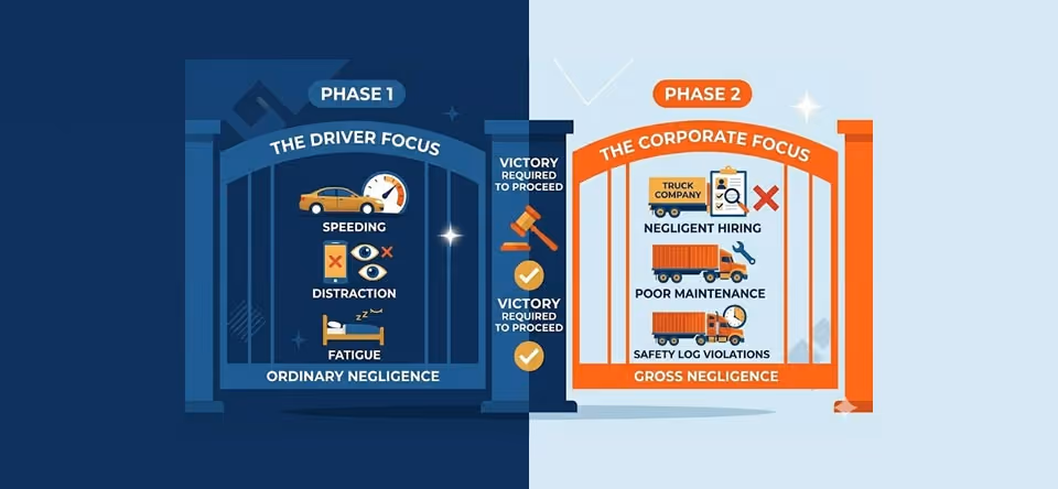 In Phase 1, you are only allowed to present evidence regarding the driver's actions at the time of the crash. You are largely barred from mentioning the trucking company’s history of safety violations or poor hiring practices. Only if you win Phase 1 can you move to Phase 2, where we can finally hold the corporation accountable for their systemic failures.